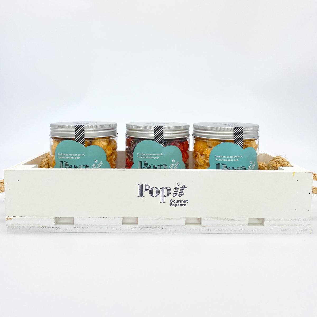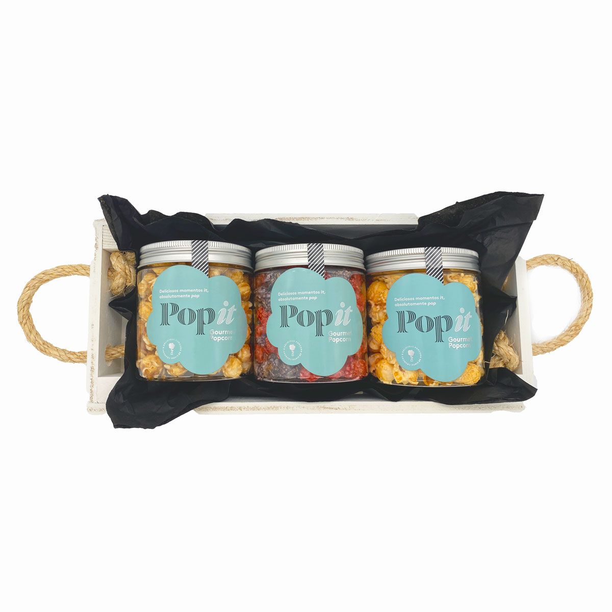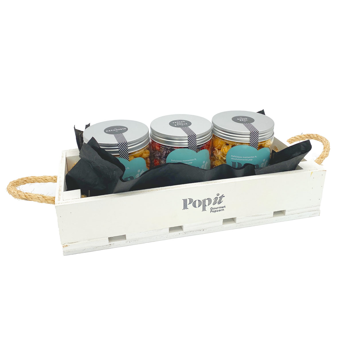 Una cesta de regalo original y con mucha personalidad. Disfruta del sabor de nuestras Palomitas Popit Gourmet y de la utilidad de la preciosa caja de regalo de madera y rafia personalizada para decorar tu hogar.