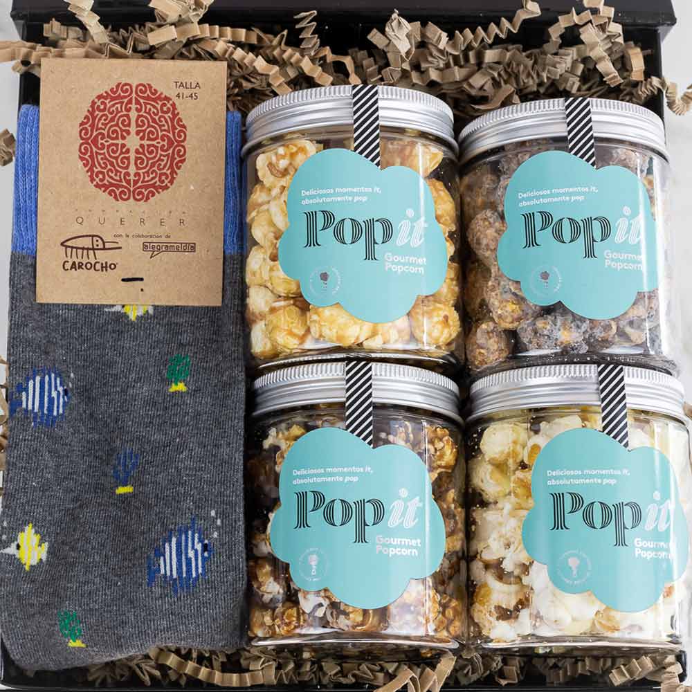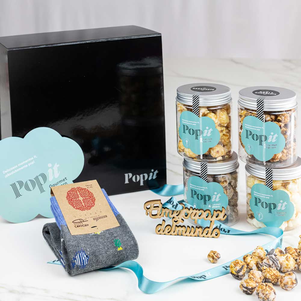Los sabores de Popit preferidos para tu papá y unos calcetines especiales para dar cientos de pasos adelante juntos. La Caja contiene palomitas de Doble Chocolate, Trufa, Salted Caramel y Cacahuete. El regalo perfecto para que el día del Padre le digas todo lo que le quieres y compartáis momentos juntos.