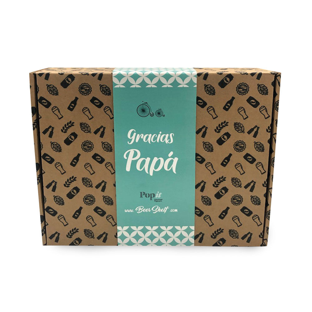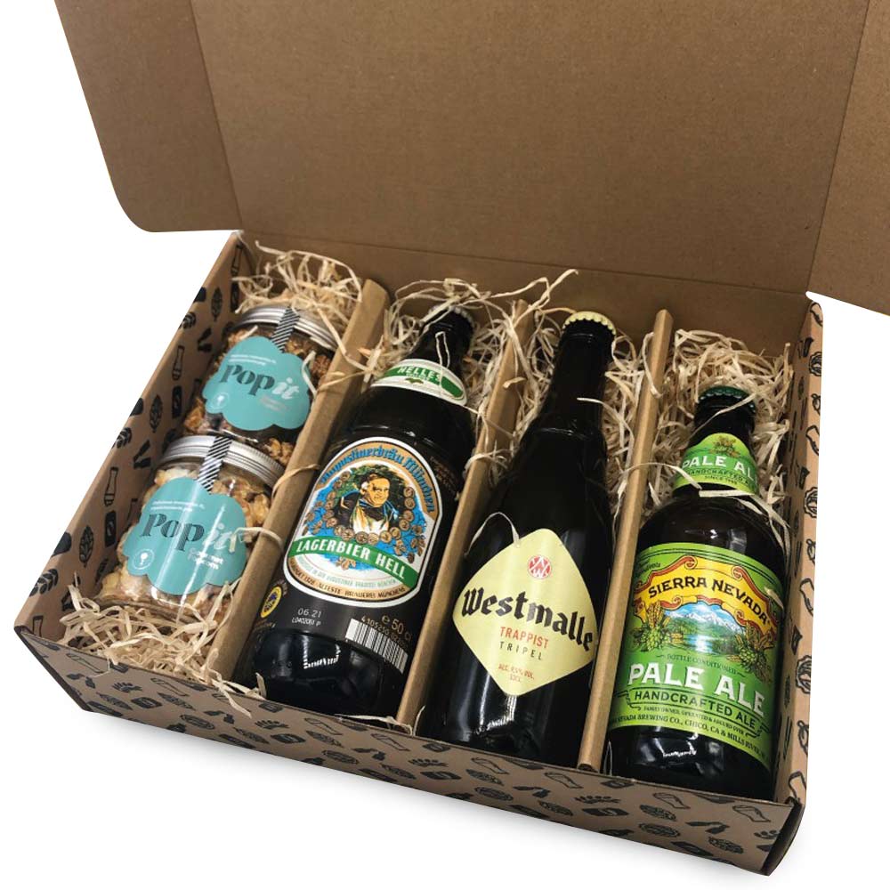 Una caja con una selección de 3 cervezas y 2 palomitas gourmet Popit que le encantarán.