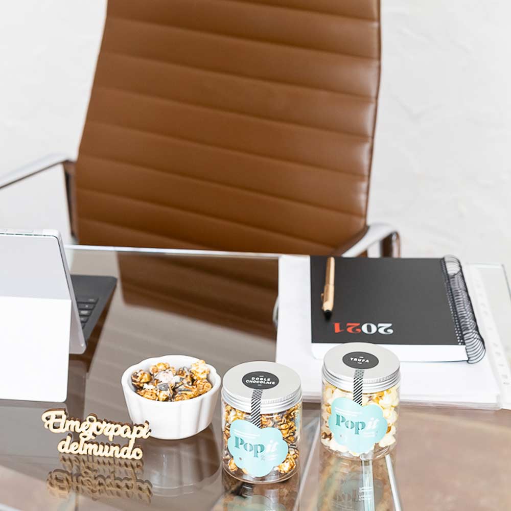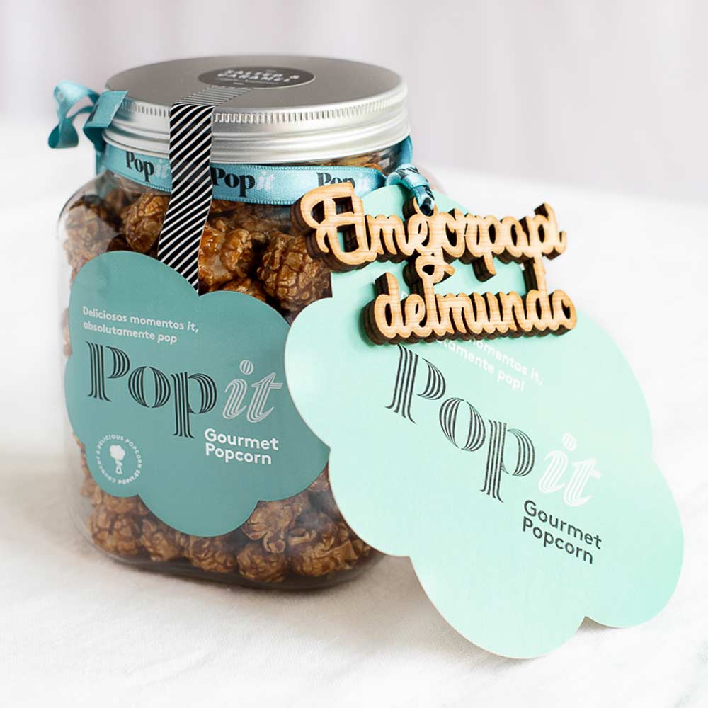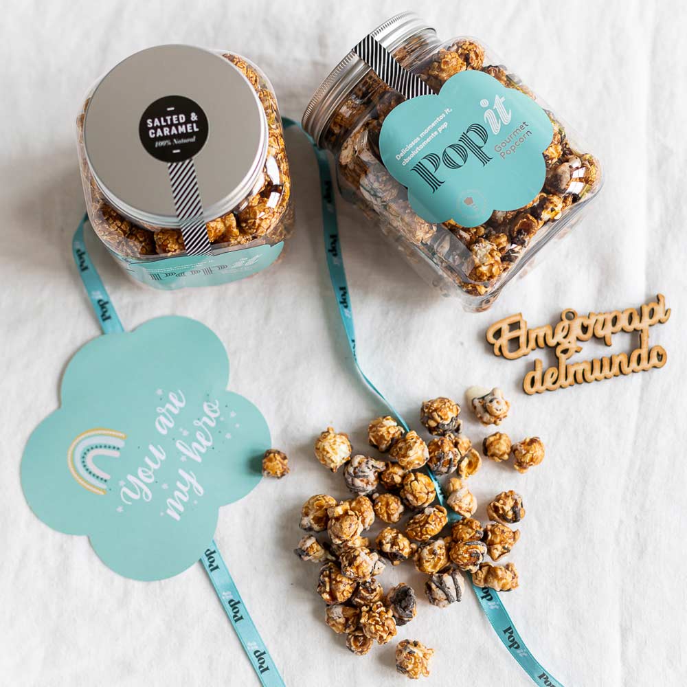 Unas palabras bonitas, un mensaje duradero y un toque dulce para el Día del Padre. Esta versión de nuestro tarrito más grande es perfecto para el grandullón de la familia. Sorpréndele con las Palomitas Popit de Doble Chocolate, Salted Caramel, Cacahuete o café y endulza su día con un detalle que le conquistará seguro. Podrá decorar su rincón de lectura, su oficina o su mesilla de noche con un mensaje que nunca se le olvidará y sin duda sonreirá cada vez que piense en ti. Además, puedes escribirle un mensaje dedicatoria para este día y lo incluimos en el tarjetón de felicitación.